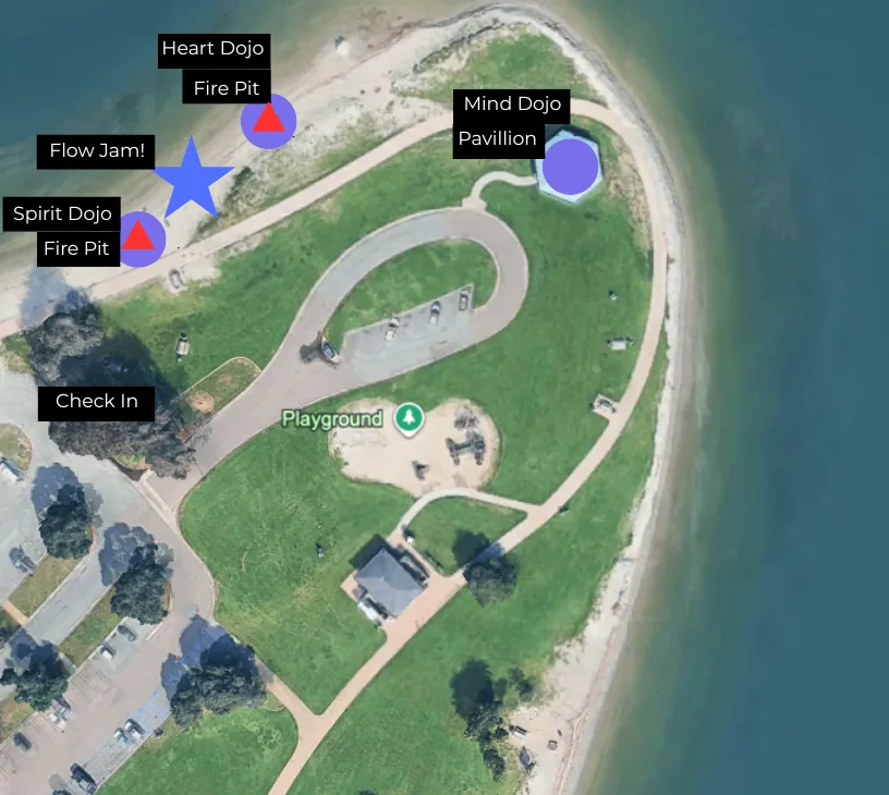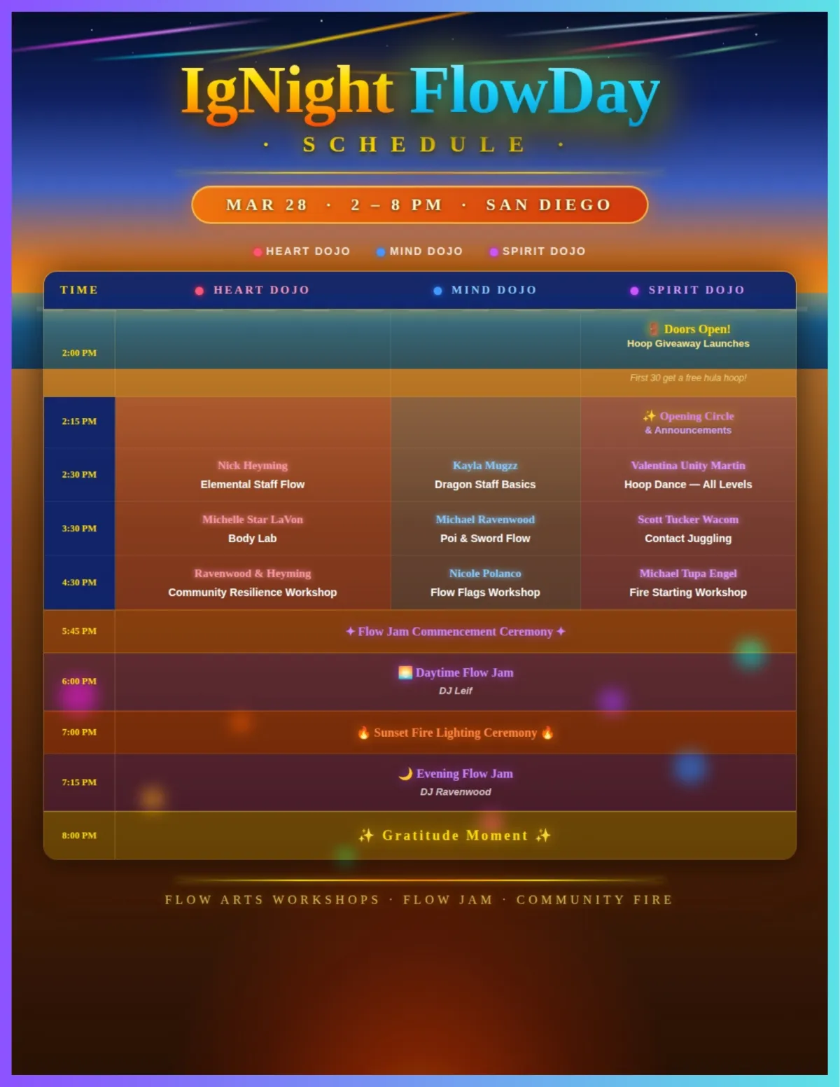 Opening Ceremony is at 2pm, and there will be 3 waves of workshops before 5:30pm when we will host a brief community circle~up before we kick off the flow jam & light up the fire pit!